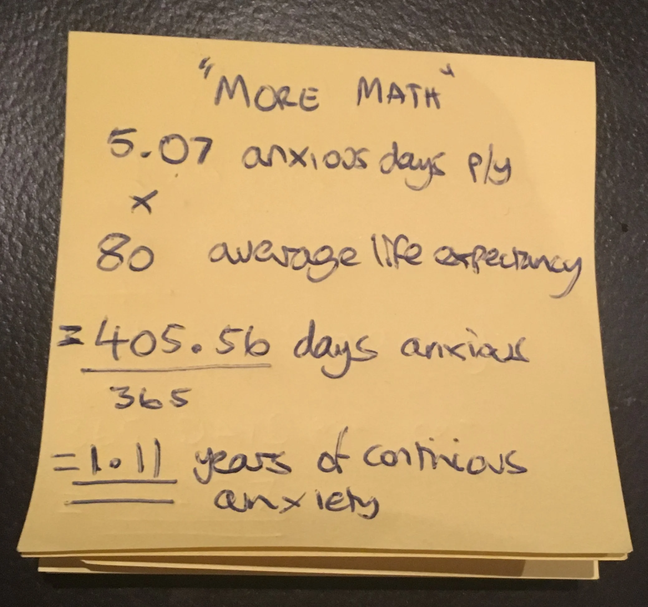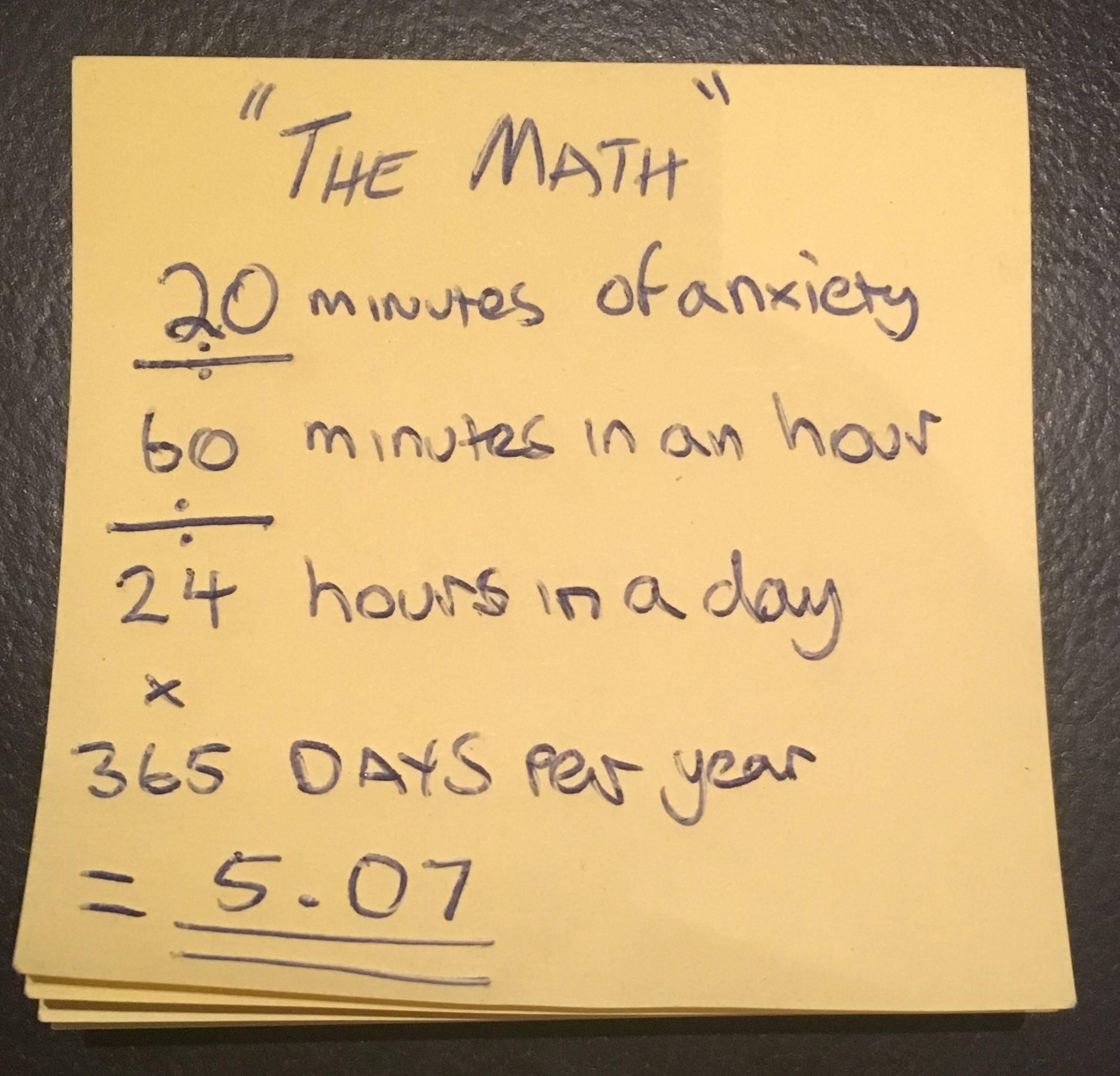 With this in mind, I wanted to work out, just how much my anxiety was costing me, and being the nerd that I am, I did the math. Whilst it is hard to determine how much time I spent just worrying (anxiety often comes comorbidly with every task I perform), I did work out how much time just 20 minutes a day of pointless rumination would cost me each year.